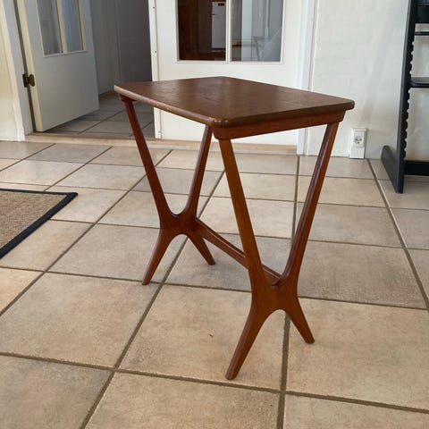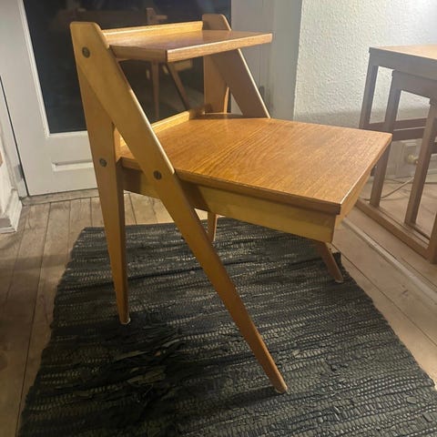 Lille teakbord med holder til aviser og blade. Pænt og velholdt
