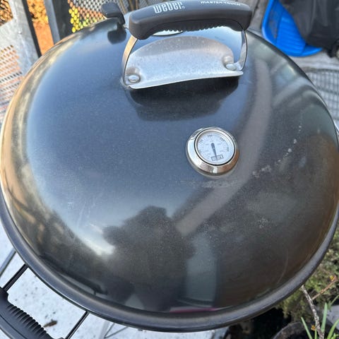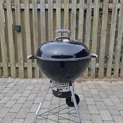 Weber kuglegrill til kul i sort. Grillen står på stativ med hjul for nem flytning og har låg med ventilationsspjæld. Kulrist og grillrist i metal. Velegnet til almindelig grillning i have eller på terrasse. På billederne ses også en grillstarter til optænding af kul.