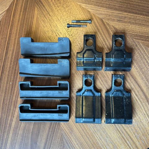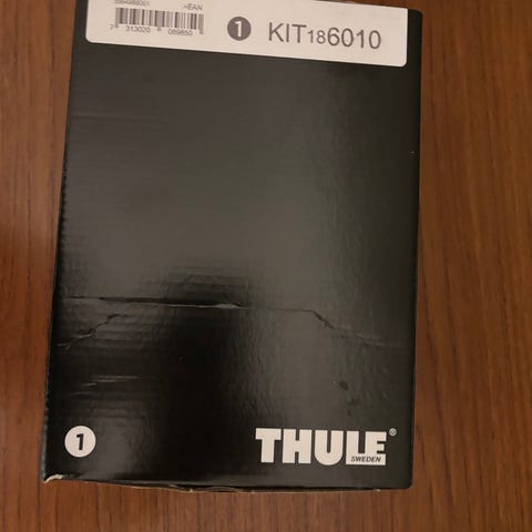 Thule tagbøjle monteringskit i sort plast. Sættet indeholder flere beslag og klodser til montering af Thule tagbøjler på bilens tag, samt tilhørende skruer og vejledning. Egnet til brug sammen med kompatible Thule tagbøjlesystemer, hvor der kræves et specifikt monteringskit til bilens tagkant eller døråbning. Beslagene er udført i hård plast og leveres med papirmanual, som viser montage og anvendelse.