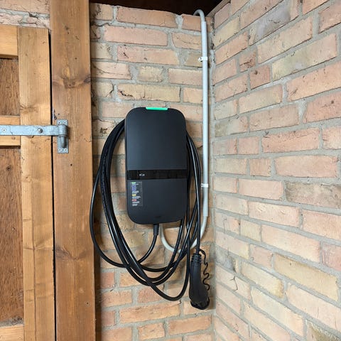 Ladeboksen er udstyret med fastmonteret ladekabel og er beregnet til vægmontering, typisk i garage, carport eller på væg ved parkeringsplads til opladning af elbil eller plugin-hybrid.