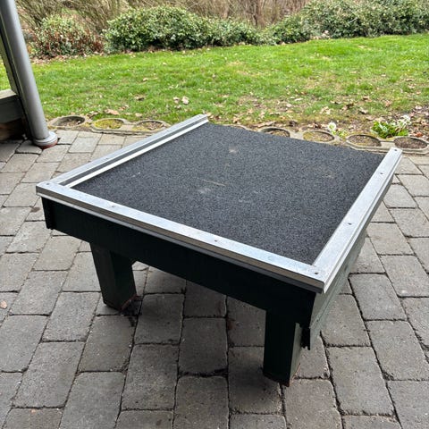 Garage til robot. Stor og "generisk" model, som vil umiddelbart kan dække alle robotter. Den måler 90 x 65 x 42 cm (L x B x H). Er i fin stand, og stod også solidt i den storm, vi havde i april 2026. Købt i april 2024. Nypris var 749 plus fragt. Jordskruer medfølger ikke, men de kan købes billigt forskellige steder.