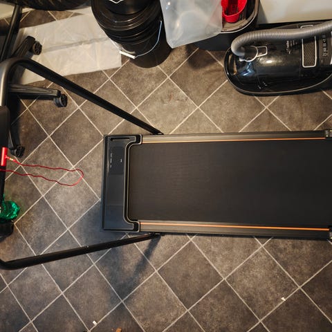 Home Fitness Code løbebånd i sort. Kompakt model med fladt løbefelt og sammenklappeligt håndtag, egnet til indendørs gang og let løb. Leveres med strømledning som vist på billederne.