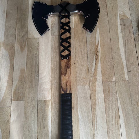 Dobbeltsidet økse med træskaft. Øksehovedet har to skær og fremstår med mønstret stål. Skaftet er udført i træ med synlig åretegning. Medfølgende læderbeskytter til øksehovedet med trykknaplukning. Velegnet som brugsværktøj, dekoration. skarp og lavet i Damaskus. Jeg kan sende gennem fix færdig da den er lille nok men normalt vil Postnord ikke tillade at man sender sådan noget med dem så ved ikke om de scanner pakken hvad der er i.