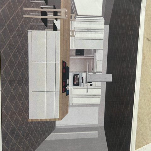Moderne køkkenindretning med køkkenø og underskabe, overskabe samt højskabe i lyst trælook. Køkkenet har integreret kogeplade induktion 1 år, opvaskemaskine 1 år, samt fritstående køleskab 8 år og emhætte. Bordpladen fremstår i en mørk, ensfarvet overflade, og der er god bord- og skuffeplads. Indretningen er velegnet til åbent køkken-alrum med spiseplads og giver mulighed for både madlavning og ophold i samme rum.