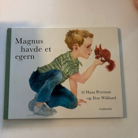 “Magnus havde et egern” af Hans Peterson og fine illustrationer af Ilon Wikland. Billedbog udgivet af Gyldendal i 1973. Sød historie om den lidt ensomme dreng Magnus, som bliver venner med en lille egernunge kaldet Jimjim. Hardback med lærredsryg i pæn stand🐿✨
