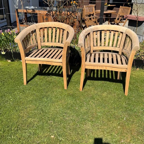 Murcia massiv teak stol i naturfarvet træ. Stolen er udført i teak med lameller i sæde og ryglæn. Egnet som spisebordsstol inde eller ude, eksempelvis på terrasse eller altan. Stolen har lige ben og let skråt ryglæn.. Kan bruges enkeltvis eller som sæt omkring et bord. Hynder medfølger. Som spritnye! Regning haves.