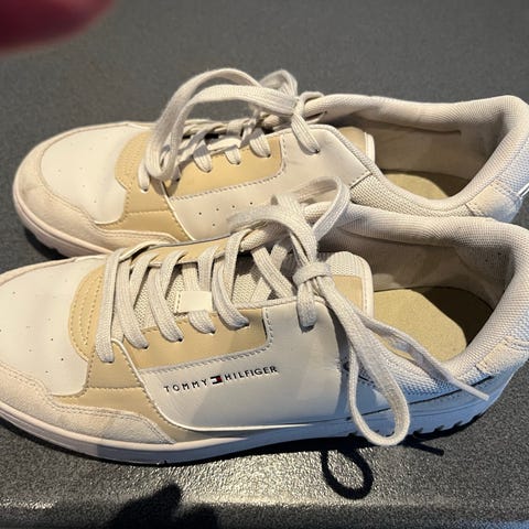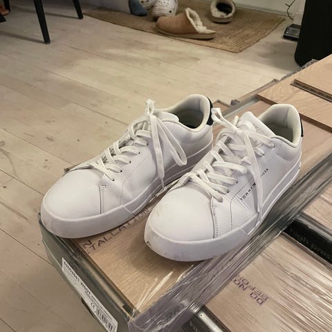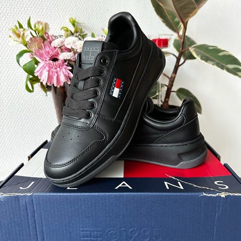 Tommy Hilfiger sneakers i størrelse 45. Modellen er i sort med klassisk Tommy Hilfiger-logo på siden. Overdelen fremstår i glat materiale med snørelukning og perforeringer ved tåen for ventilation. Skoene har polstret kant og tunge for øget komfort samt kraftig ydersål med mønster, der giver godt fodfæste. Velegnet som hverdagssko eller fritidssko.