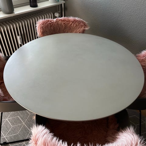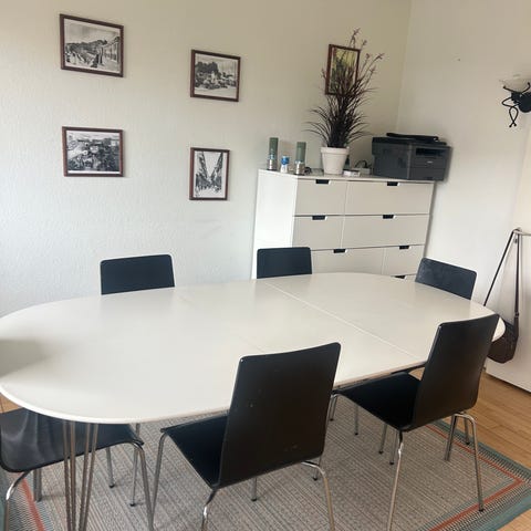 Der medfølger 4 stole. Den ene stol har en plet, som meget muligt kan fjernes ved en grundig rengøring.