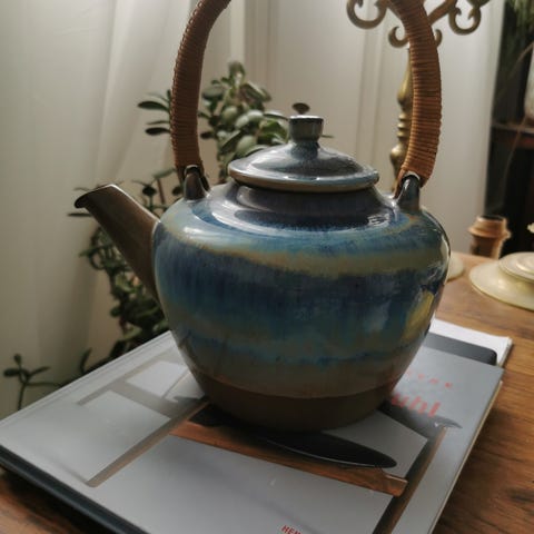 Palshus tekande i blåglaseret keramik. Tekanden har låg og buet tud samt hank i flet, der er fæstnet i begge sider af kanden. Undersiden er mærket "Palshus Denmark" med model- og pottemærkning. Egnet til servering af te eller som dekorativt indslag i køkken eller spisestue.