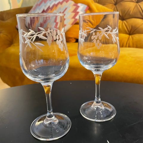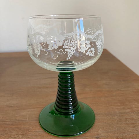 Ældre glas til f eks hvidvin eller rhinskvin. Gul stængel og fod, blomsterslibninger på kumme. Højde 17 cm, diameter foroven 6,5 cm. Fin stand, rene og pæne. Der findes 12 stk, prisen er pr stk.