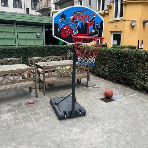 Basketstander med rektangulær plade, metalstativ og plastfod, der kan fyldes med vand for at standeren står stabilt. stabilitet. Kurven er monteret på en justerbar stang, så højden kan tilpasses. Egnet til udendørs brug på indkørsel, terrasse eller have til almindelig basketballtræning og leg.