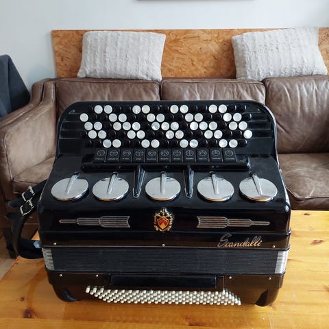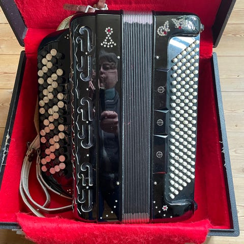 Borsini harmonika af typen knapakkordeon i sort, med kasse, som også er super velholdt. Der mangler desværre en knap der er bortkommet.