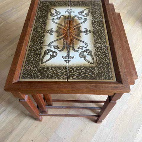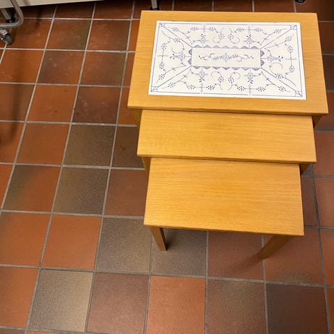 3 fine retro kakkelborde / indskudsborde fra 60’erne. Der er to bordben, som skal have lim for at sidde helt fast.