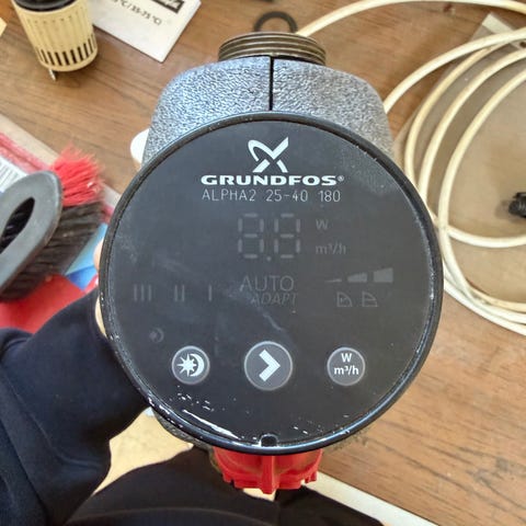 Grundfos Alpha2 25-40 180 cirkulationspumpe til varmeanlæg. Pumpen har elektronisk display med visning af effektforbrug og betjeningsknapper på fronten. Der medfølger isoleringskappe og beslag, som ses på billederne, samt brugervejledning.