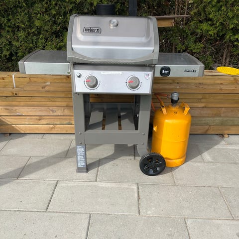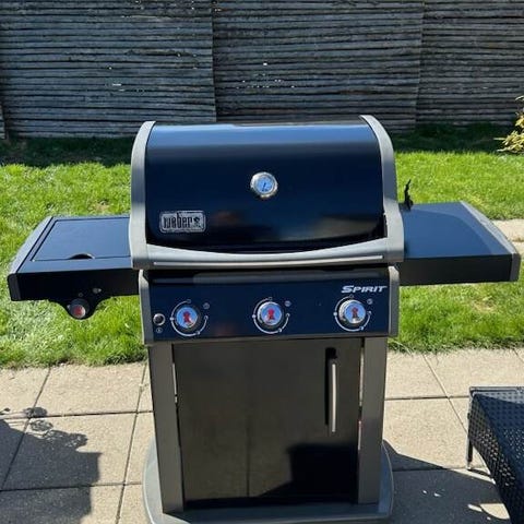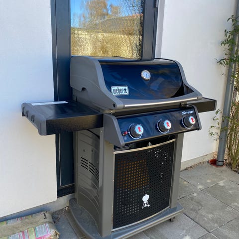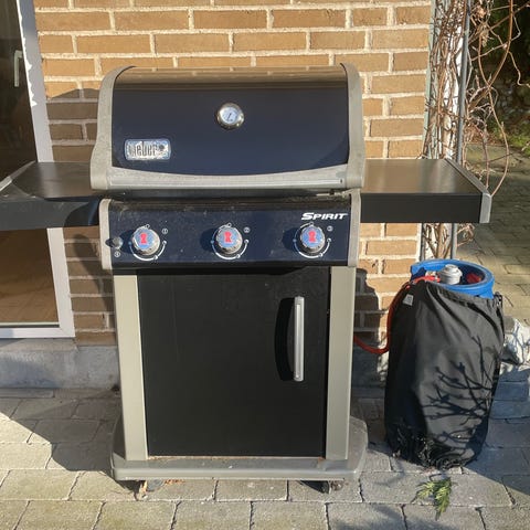 Weber Spirit Classic gasgrill i sort. Gasgrillen har låg med indbygget termometer, grillrist og arbejdsbord i siden. Der er sidebrænder i venstre side med separat låg og betjeningsknapper. Under grillen er der skab med låger til opbevaring. Grillen står på hjul for nem flytning. Der medfølger gasregulator og slange ( skiftet i efteråret 2025) samt overtrækscover med Weber-logo.