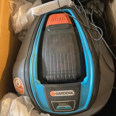 Gardena R38Li robotplæneklipper. Batteridrevet robotplæneklipper til automatisk klipning af græsplæne. Enheden kører selvstændigt inden for et afgrænset område ved hjælp af afgrænsningskabel. Velegnet til mindre haver, hvor man ønsker jævn og regelmæssig klipning uden manuel betjening. Leveres med tilhørende ledninger og tilbehør som vist på billederne, hvis dette medfølger fra sælger.