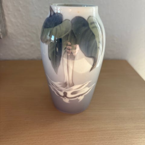 Hutschenreuther vase i lyseblå porcelæn med håndmalet blomstermotiv og sommerfugl. Vasen er cylindrisk med let konisk form og har guldkant langs åbningen. Undersiden er mærket med Hutschenreuther-stempel samt håndskrift med dato og navn. Velegnet som dekorativ vase til blomster eller som pyntegenstand i hjemmet.