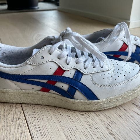 Asics sneakers i størrelse 42,5. Modellen er i hvid med mørkeblå og røde detaljer på siderne samt Asics-logo på pløs og hæl. Klassisk snørelukning og perforeret tåparti. Egnet som hverdagssko og fritidssko.