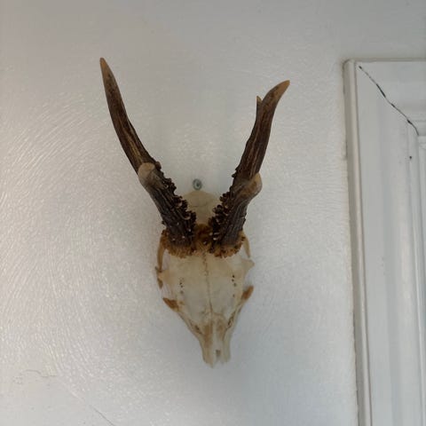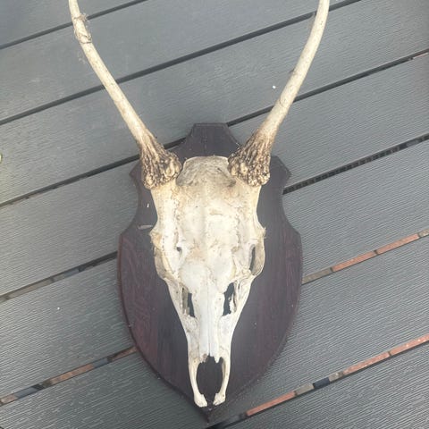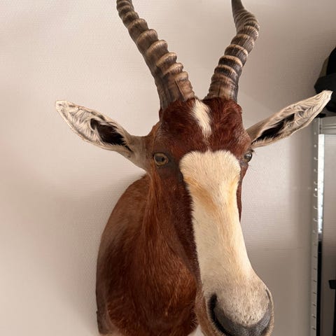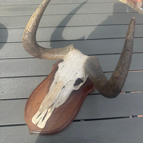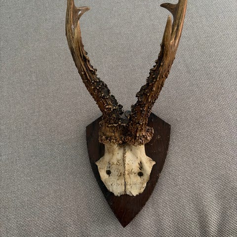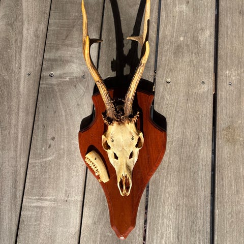 Bukkeopsats med kranie og gevir monteret på mørk træplade. Velegnet som vægdekoration eller jagttrofæ i hjem, jagtstue eller lignende. Opsatsen fremstår med naturlig patina på både kranie og gevir. Monteringshul på bagsiden af pladen gør den klar til ophæng.