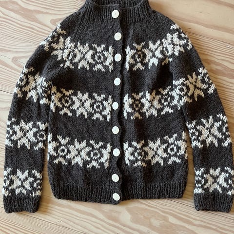 Gudrun Sjödén cardigan i uld i str. XS. Cardiganen er brun med mønsterstrik i kontrastfarve og har gennemgående knaplukning foran. Fremstillet i uld og designet til kvinder i en tætsiddende model med lange ærmer.