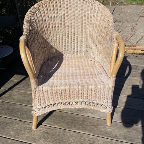 10 Ti Havestole i flet i naturfarvet look. Stolen har armlæn og høj ryg samt lige ben. Velegnet til brug på terrasse, altan eller i haven. Materialet fremstår som flettet plast eller polyrattan med metalstel under fletværket, egnet til udendørs brug afhængigt af producentens anvisninger.