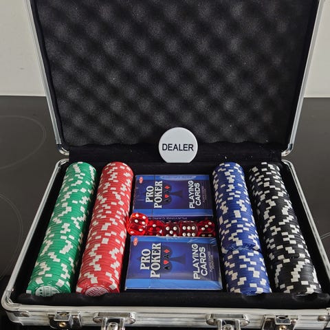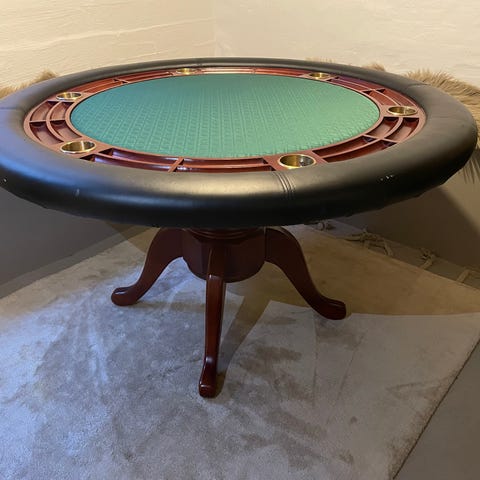 Pokerbord i oval form med grønt filtspillefelt og trykt mønster. Bordet har polstret sort kant hele vejen rundt for armstøtte samt indbygget område til jetoner eller dealerplads. Velegnet til poker og andre kortspil i hjemmet eller i et spillelokale. På kanten ses synlige brugsspor på enkelte områder, som vist på billederne.