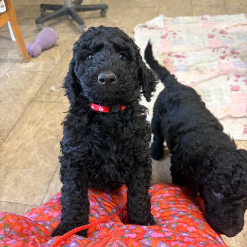Hvalpene er nu 6 uger gamle og vokser op i trygge omgivelser med masser af kærlighed. De er: