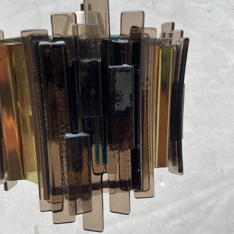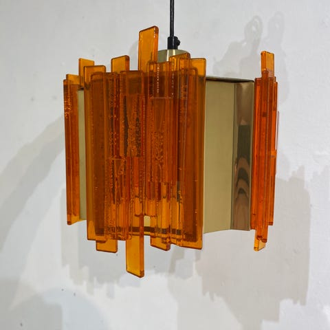 Pendel af aluminium, messing med skærme af klar og farvet akryl. 1960'erne. H. 23 Ø 25 cm. Hentes på Refshaleøen