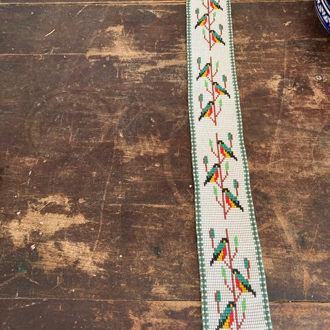 i tekstil med korsstingsbroderi. Bånd i lys beige med grøn kant og gule blomster som motiv.