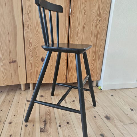 IKEA børnestol i sort. Klassisk træstol med ryglæn bestående af lodrette tremmer og firkantet sæde. Egnet til børn ved spisebord, skrivebord eller i legehjørne. Neutral farve, der passer ind i mange typer indretning.