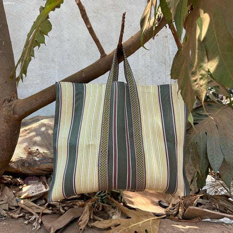 Det er stribet i flere farver: olivengrøn, mørkegrøn, creme, turkisblå, karrygul og lyserød.