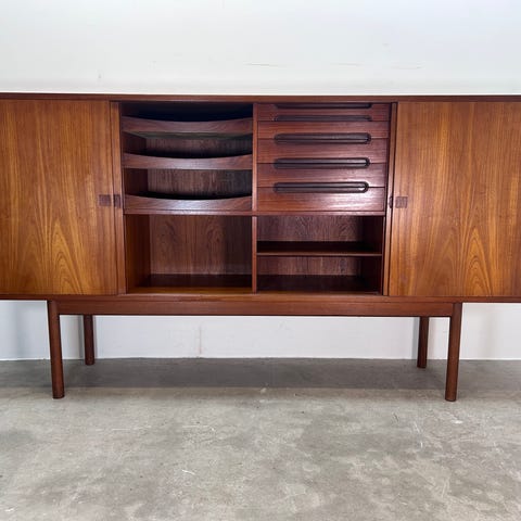 Omann junior Svævende dobbelt skænk i fineret teak opsat på stel af massiv teak .