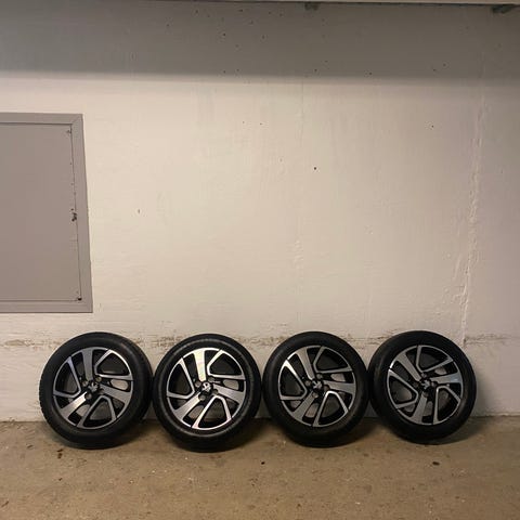 Alle 4 hjul er i pæn stand, ingen kendte skader eller lapninger, kun almindelige brugsspor. Bolte følger med i lille pose, så de er lige til at montere på bilen.