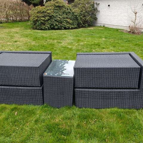 Havemøbelsæt bestående af to loungestole og en skammel i grå polyrattan med mørke hynder. Stolene har høj ryg og armlæn samt løse sæde- og ryghynder. Skamlen har matchende hynde og kan bruges som fodskammel eller ekstra siddeplads. Sættet er egnet til terrasse, altan eller udestue og er udført i vejrbestandigt materiale, der er let at rengøre.
