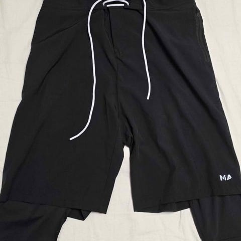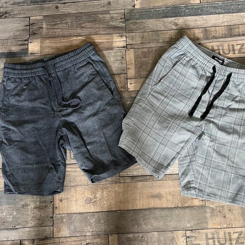 Herre shorts i størrelse L. Sættet består af to par shorts, et par i sort og et par i mørkegrøn. Begge har elastisk linning med snøre for justerbar pasform. Velegnet som hverdagsshorts eller til sport og fritid.
