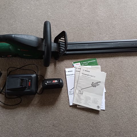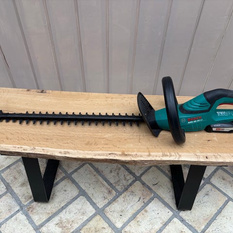 Bosch AHS 55-20 LI hækkeklipper med 18V lithium-ion batteri. Batteriet er 18V 1,5 Ah. Medfølgende oplader ses på billederne. Hækkeklipperen har dobbeltslebne skær og er egnet til klipning og trimning af hække og buske i haven.