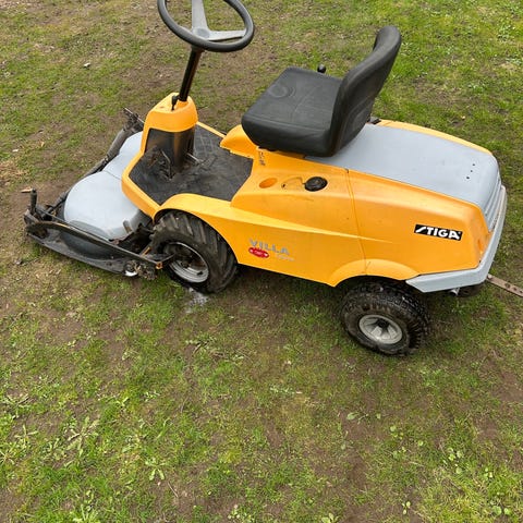 Stiga Villa 12 havetraktor med frontmonteret klippeaggregat. Modellen er udstyret med Briggs & Stratton 12,5 hk benzinmotor. Traktoren har førersæde med ryglæn, ratstyring og fire hjul. Frontklipperen giver godt udsyn til klippeområdet og gør det muligt at komme tættere på kanter og forhindringer. Velegnet til græsslåning af mellemstore til større græsarealer i private haver eller lignende områder.
