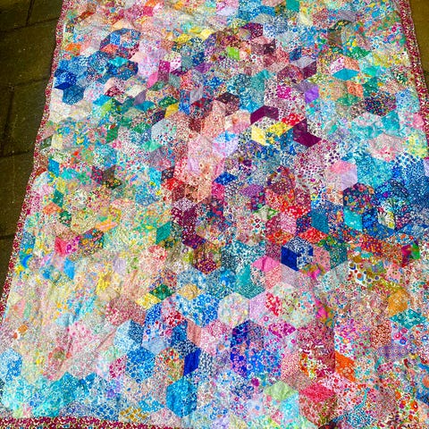 Stort håndlavet patchworktæppe / quilt med hjerter – 128 x 176 cm