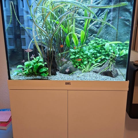 Juwel akvarium med underskab i hvid. Akvariet står på et matchende skab med to låger og metalgreb, som giver plads til opbevaring af udstyr. Indvendigt ses bundlag af grus, levende planter og forskellige ferskvandsfisk. Velegnet som komplet akvarieløsning til stue eller opholdsrum.