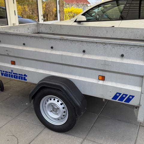 Variant trailer i galvaniseret stål, enkelakset model. Åben ladtrailer med faste sider og træbundplade. Egnet til transport af haveaffald, materialer og mindre gods. Trailer med standard kuglekobling til personbil og mekaniske støttebeslag på siderne. Nummerplade og lygter monteret bagtil. Velegnet til almindelige transportopgaver i hverdagen. Nysynet, ny bund og nye lejer. Uden nummerplade. 1,24x2,00