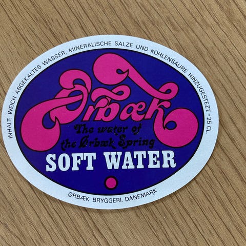 Ørbæk Brown Cola etiket i oval form. Etiketten er i orange, hvid og brun med teksten "The water of the Ørbæk Spring Brown Cola" samt oplysninger om indhold langs kanten. Egnet som samlerobjekt for etiketter eller bryggerirelaterede effekter fra Ørbæk Bryggeri, Danmark.