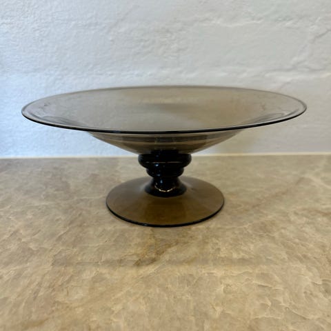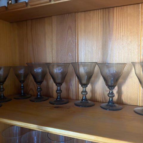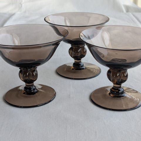 Røgfarvet drikkeglas. Serien hedder vist nok Primula. De fremstår flotte og intakte. De måler cirka 9 cm høje.