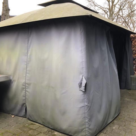 Pavillon i hvid farve, størrelse ca. 3x3 meter. Består af metalstel og hvid dug. Egnet til brug i haven, på terrasse eller ved udendørs arrangementer som midlertidig overdækning mod sol og let regn. Leveres adskilt med stænger, beslag og dug som vist på billederne.