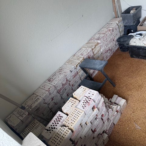 Mursten hulsten i grå beton. Rektangulære sten med gennemgående huller i den ene flade, velegnet til mure, belægning eller andre byggeprojekter, hvor der ønskes dræn eller ventilation gennem stenen.