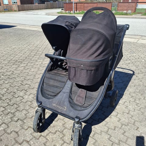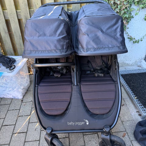 Baby Jogger city mini GT2 double i sort. Vognen har to side‑om‑side sæder med individuelle justerbare kalecher (se revne på den ene) og 5-punkts seler (mangler på den ene).