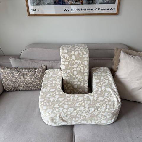 Den U-formede pude, som dine babyer kan ligge på. Den har understøtninger bagpå for at holde puden vandret og holde dine babyer på plads (med en lille kramme).
