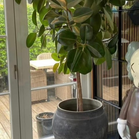 Flot stort gummitræ, 180 cm højt og 150 cm bredt. Det skyder nye blade hele tiden. Fast pris! Kan leveres i Kbh for 300,- Krukke medfølger ikke!