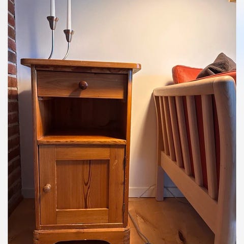 Sødt gammelt afsyret fyrretræs skab med mamorplade. Måler 38 × 75 × 39.
