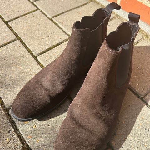 Gant støvler i størrelse 44. Chelsea-inspireret model i brun ruskind med elastik i siderne og strop bagpå skaftet for lettere af- og påtagning. Flad sål med let hæl og rund snude. Velegnet som hverdagssko eller til mere pænt brug i overgangs- og efterårssæsonen.
