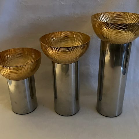 Georg Jensen lysestager i metal med guldfarvet skål og sølvfarvet fod. Sættet består af to stager i forskellig højde med rillet, struktureret overflade i skålen. Lysestagerne er egnede til bloklys eller større fyrfadslys og kan bruges som dekorative elementer på bord, reol eller vindueskarm.